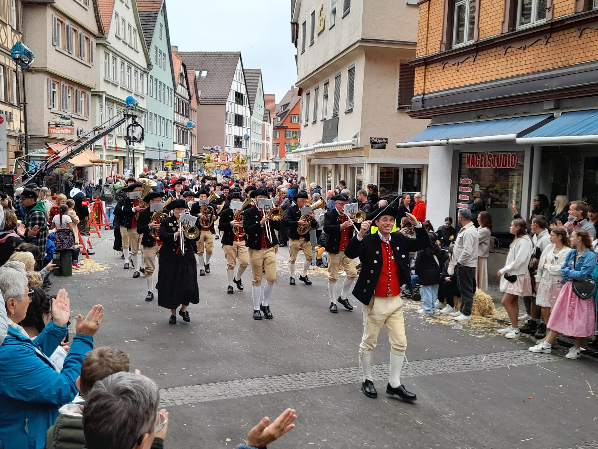Am vergangenen Sonntag, 28. September, liefen die Stadtkapelle in voller Montur und ihre historische Entourage beim Festumzug zum 178. Cannstatter Volksfest mit. Mit der Startnummer 81 vorne dran, ging es mehrere Kilometer durch Bad Canstatt. Alles im Gleichschritt und mit den teils mehreren Kilo schweren Instrumenten vor der Brust. Wohl dem, der sich bei der Instrumentenwahl für etwas kleines, handliches wie eine Flöte entschieden hat. Manch Anderer mit weniger Weitsicht spielt Tuba.